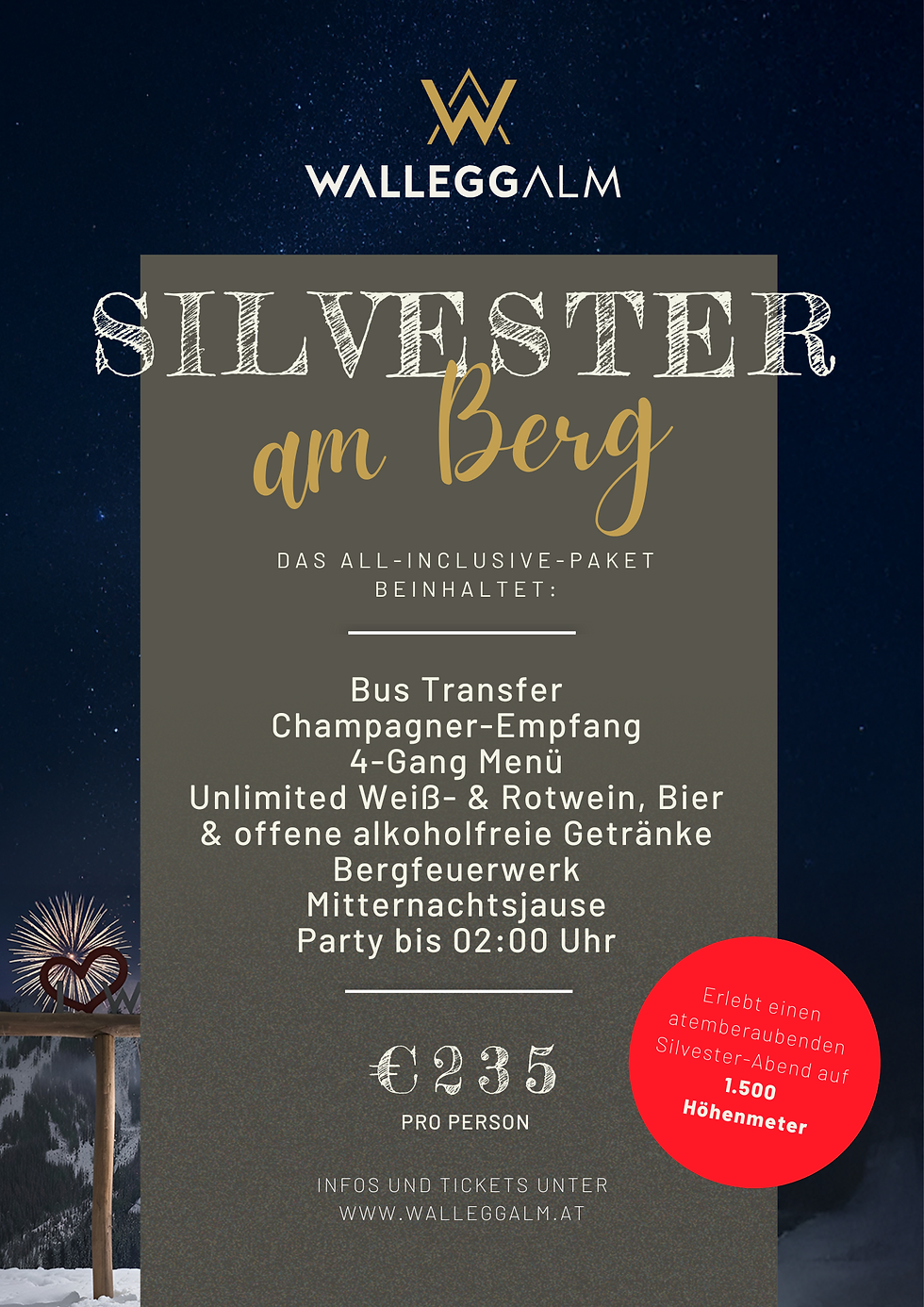 Silvester auf der Walleggalm in Saalbach-Hinterglemm auf 1.500 Höhenmeter bedeutet ein stilvoller Jahreswechsel hoch über dem Tal – mit großem Feuerwerk, festlichem 4-Gang Menü, Musik und echter alpiner Lebensfreude.